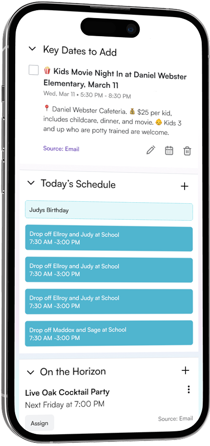 From “sign the permission slip” to “RSVP for Emma’s birthday” to “dress for crazy hair day,” you’ll get the right details, at the right time, in one place.